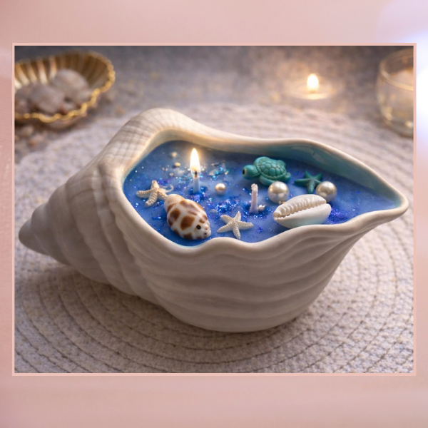 شمعة بحرية تنبض بالحياة عند الإشعال، حيث يمتزج اللون الأزرق مع بريق الأصداف تحت ضوء الشعلة الدافئ.