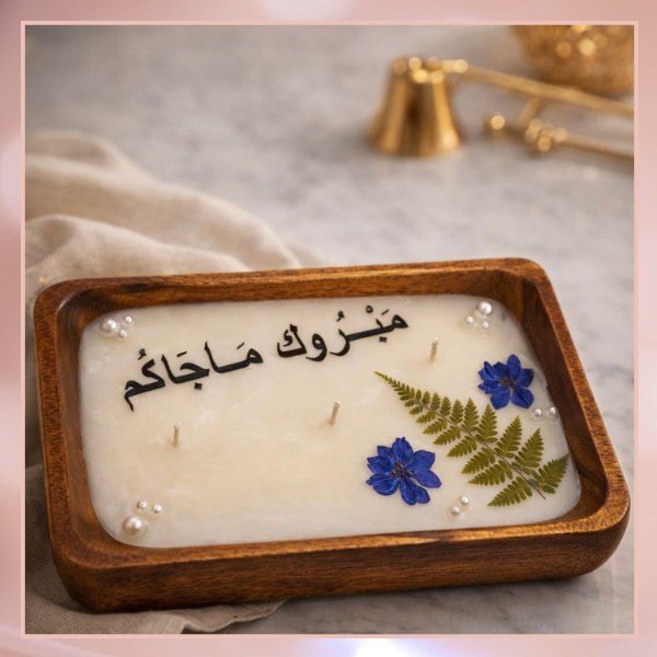 احتفي بسلامة أحبابك مع طقم الشمعة الخشبي المزين بالزهور الطبيعية المحفوظة وعبارة الترحيب الدافئة
