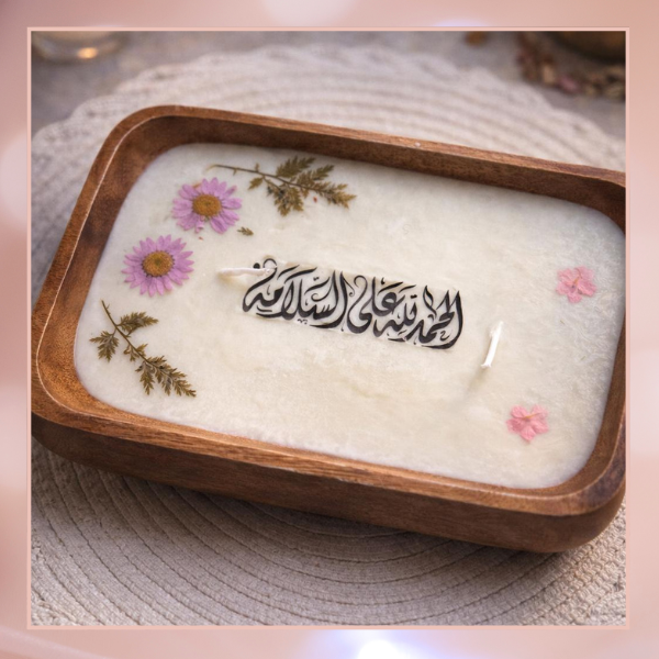 عبّري عن مشاعرك الصادقة بقطعة تجمع بين الطبيعة والفن، مصممة خصيصاً لمناسبات العودة والشفاء. شمعة فاخرة تتوسط صينية من الخشب الطبيعي المستطيل، تحمل عبارة “الحمد لله على السلامة” بخط عربي أنيق يفيض بالرقي. تزدان القطعة بزهور طبيعية محفوظة تحافظ على رونقها طويلاً، مما يجعلها هدية تذكارية تدوم لسنوات. بستايلها الدافئ والريفي المعاصر، تُعد هذه الصينية إضافة مثالية للمنازل التي تبحث عن الجمال المستوحى من الطبيعة، مع خيارات عطرية تملأ الروح بالسكينة.